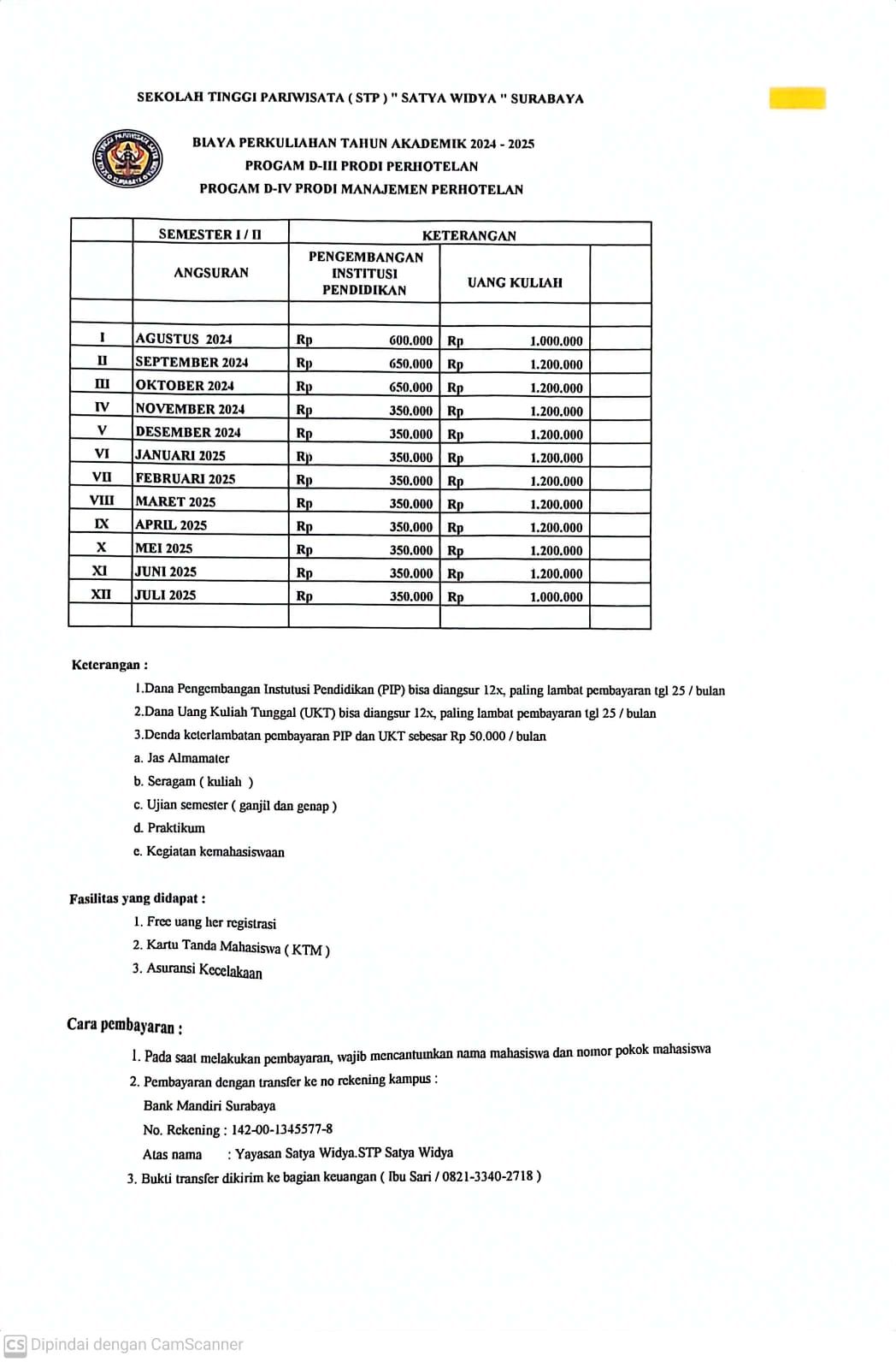 RINCIAN BIAYA MAHASISWA BARU 2024-2025 (Semester I/II Prodi Perhotelan)